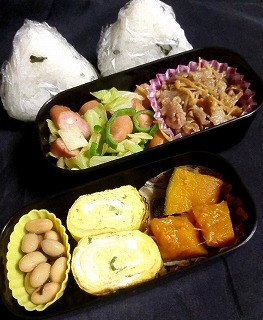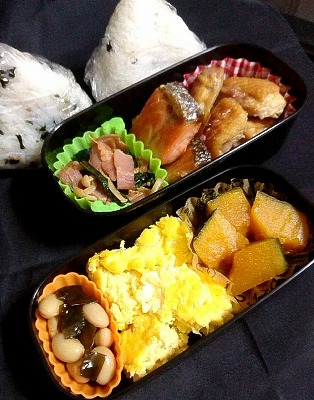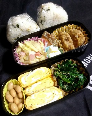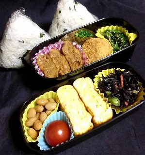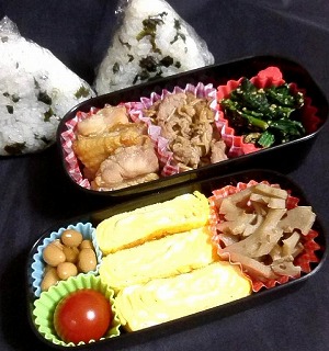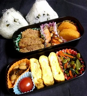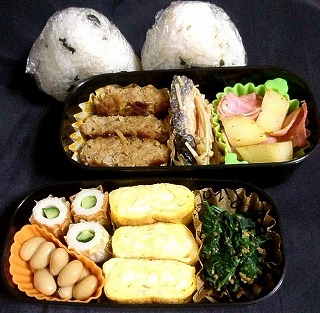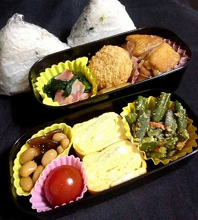 お弁当箱、2段ともおかずで埋めて、ご飯はラップおにぎりを作ることに。
