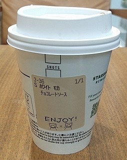 というわけで、ホットのホワイトモカに、チョコレートソースのトッピングを付けて、注文。